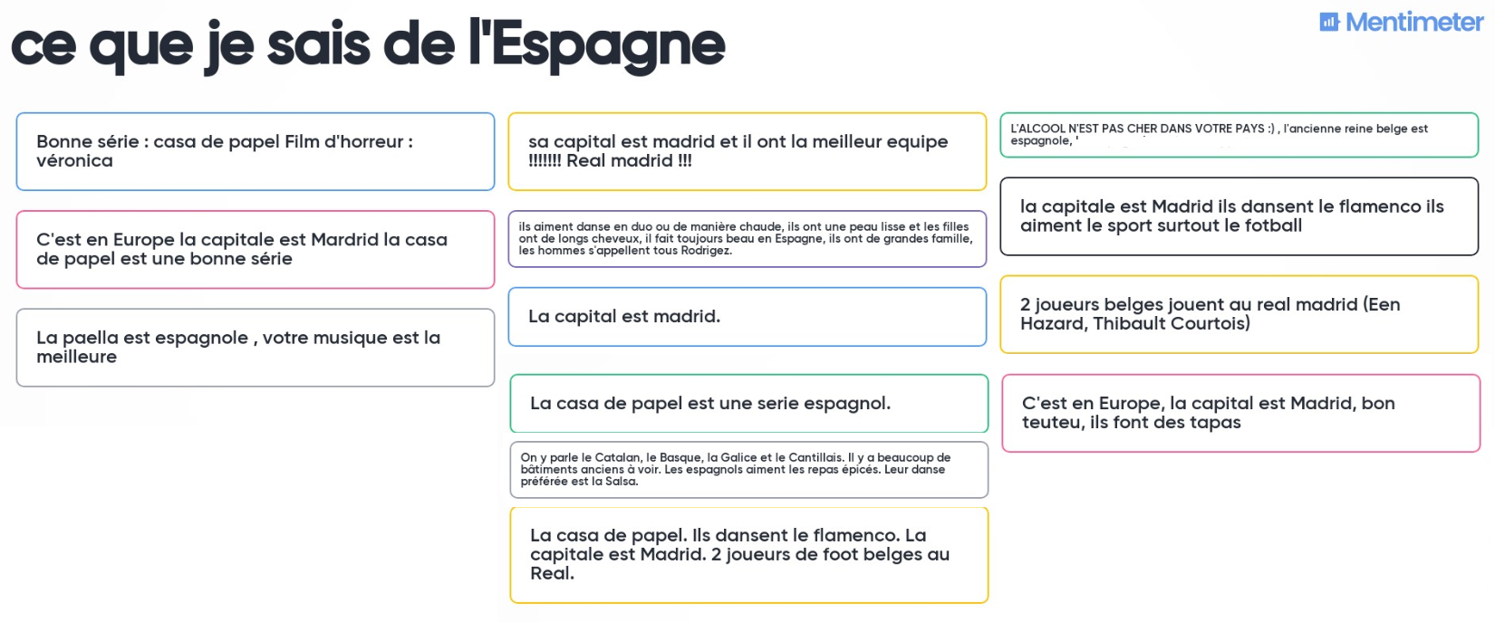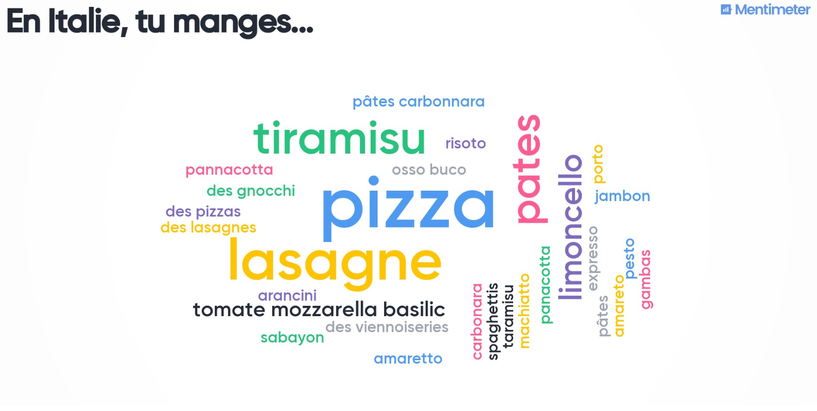 Les élèves participent à un mentimeter pour partager leurs connaissances sur les partenaires: "ce que je sais de ton pays" et "En.... je pense que tu manges". Les résultats sont ensuite partagés sur le Twinspace.